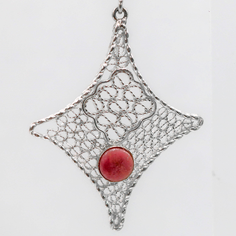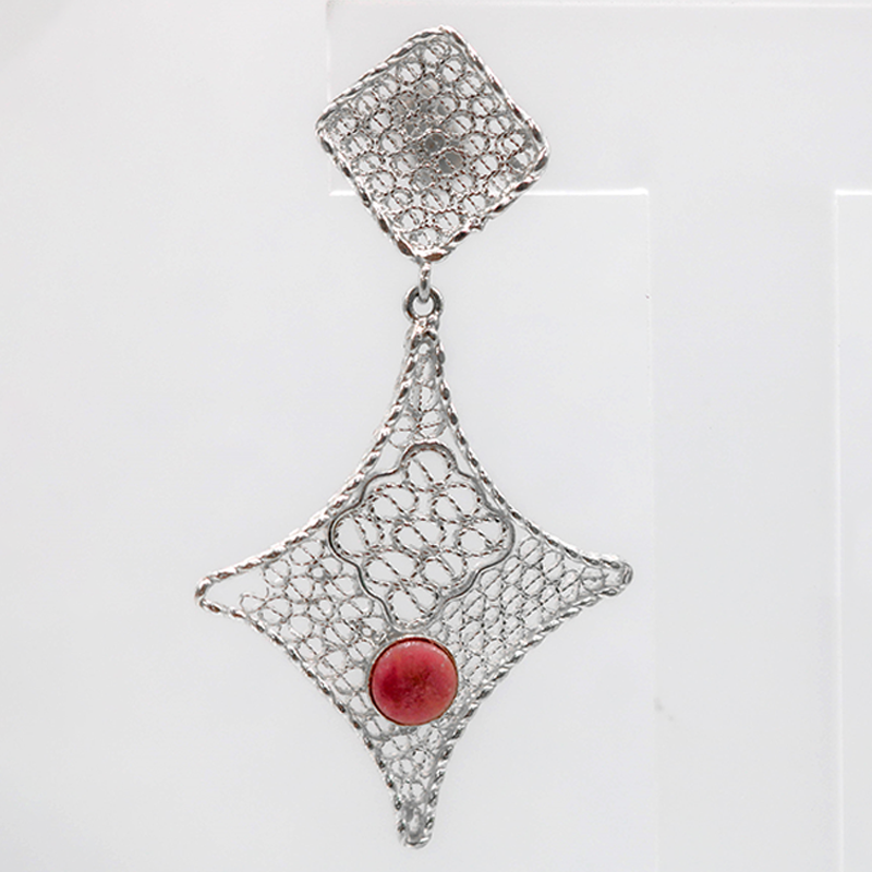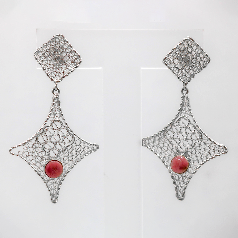 La pieza central de estos aretes es la piedra spondylus, un material natural de origen marino que ha sido utilizado desde tiempos ancestrales en joyería. Su color rosa intenso aporta un toque de calidez y luminosidad, complementando a la perfección la plata.