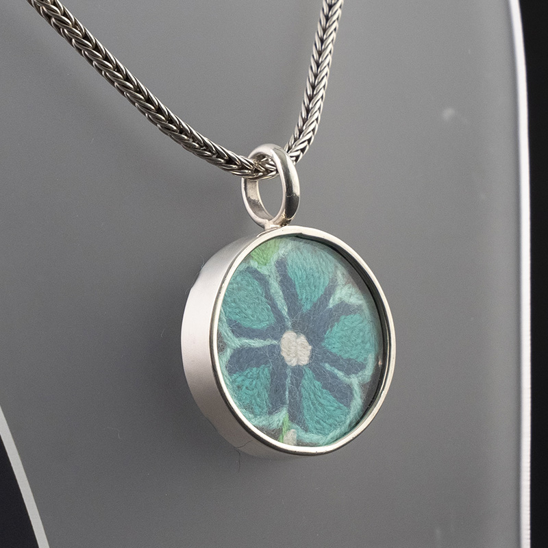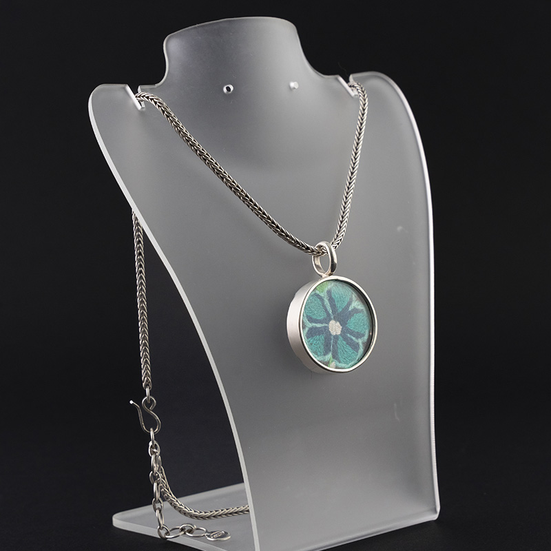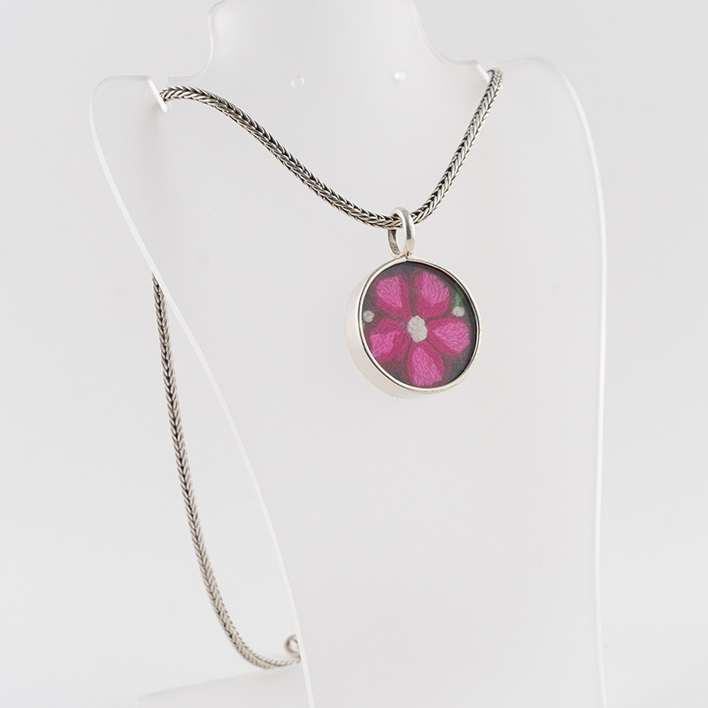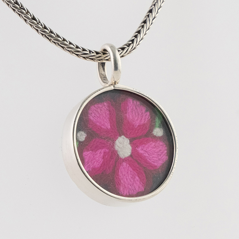 La Cadena Sumaq Wayta cuenta con una cadena de plata de estilo bizantino, que aporta un toque de elegancia y sofisticación. El dije, de forma circular, está elaborado en plata quemada y alberga un pequeño cuadro de vidrio en cuyo interior se encuentra un delicado bordado floral. Los pétalos de la flor, realizados con hilos de seda de colores vibrantes, contrastan con el fondo oscuro del bordado, creando un efecto visual impactante.