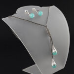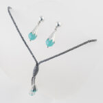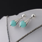 El collar cuenta con un diseño estilizado de caída, donde las piedras amazonitas son el centro de atención, sostenidas por finos acabados en plata texturizada que realzan su belleza. Los aretes complementan a la perfección, con la misma armonía de materiales y piedras, creando un conjunto ideal para mujeres que buscan un equilibrio entre la naturaleza y la sofisticación.