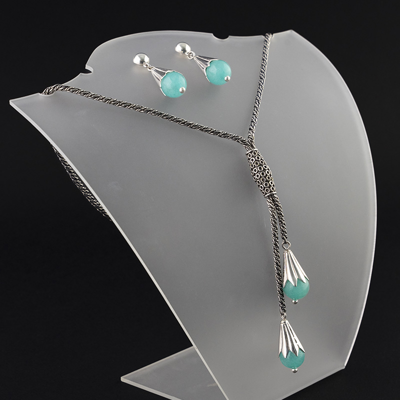 Este juego completo es perfecto para ocasiones especiales o para elevar cualquier atuendo con un toque natural y elegante. La plata quemada, combinada con las piedras amazonitas, asegura que cada pieza sea una obra de arte, fusionando tradición y modernidad en una joya atemporal.