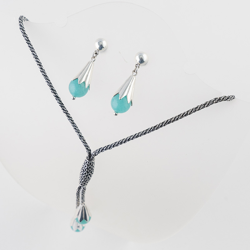 Juego completo de la Colección Amazonia en plata quemada 925 y piedras amazonitas. Un diseño elegante y natural que evoca la esencia de la Amazonía.