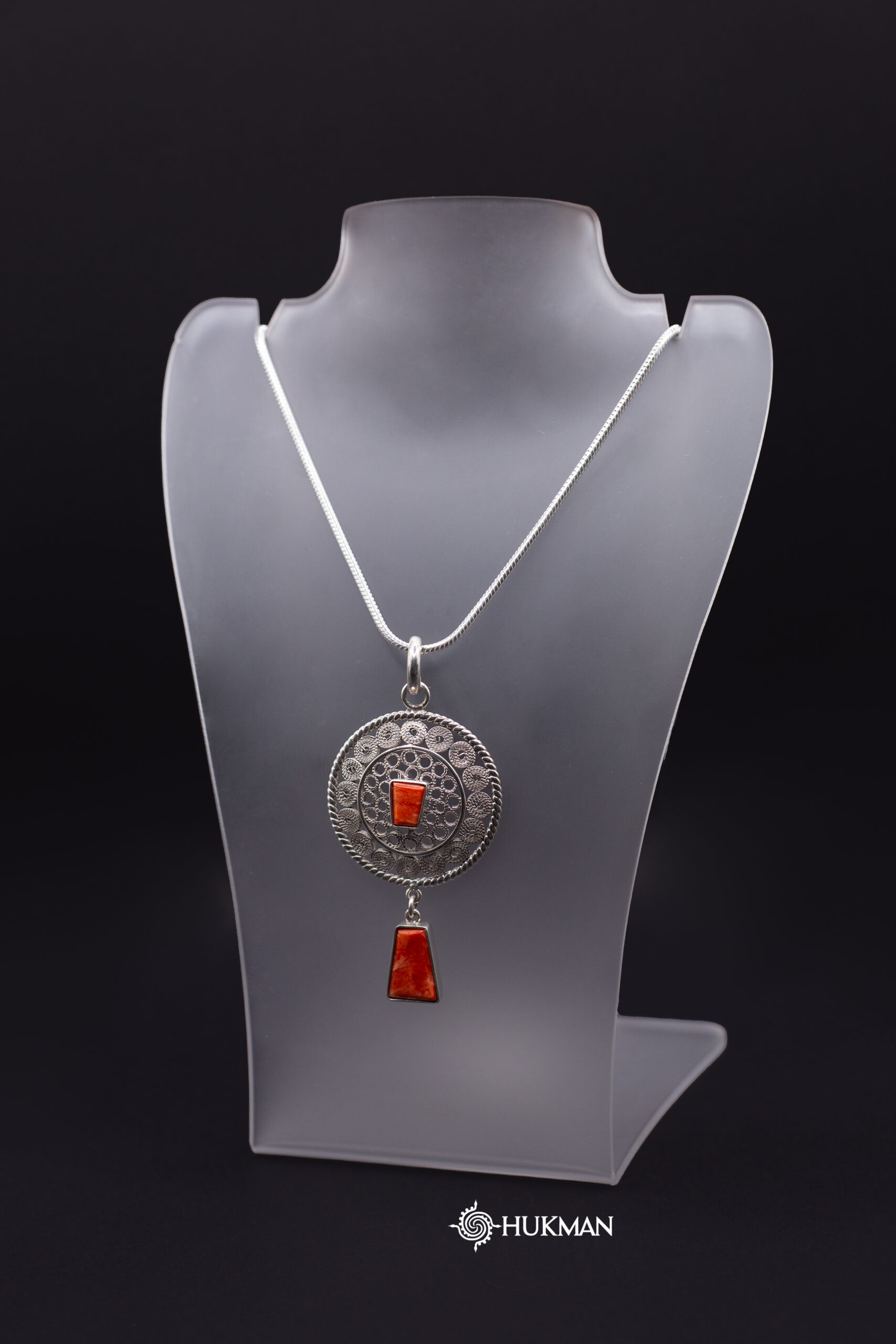 COLLAR HECHO A MANO CON LA TECNICA DE FILIGRANA EN PLATA 925 Y CONCHA ESPONDILUM NARANJA