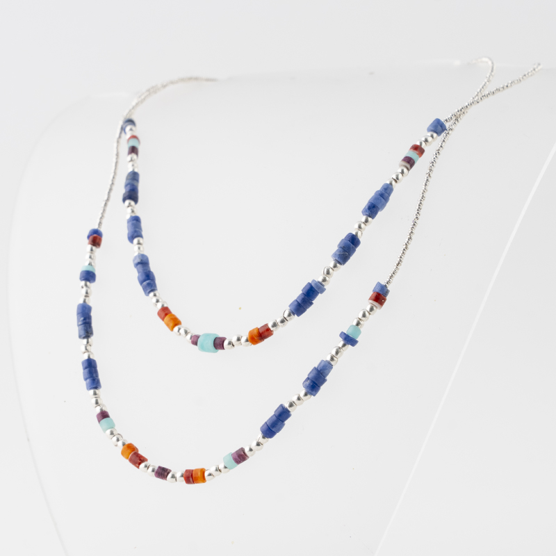 Significado: El nombre «Iskay Rumi» significa «dos piedras» en quechua, haciendo referencia a las dos cadenas que componen el collar. Cada piedra utilizada en este collar tiene un significado especial en diversas culturas: el lapislázuli representa la sabiduría y la verdad, el ópalo simboliza la esperanza y el amor, y el spondylus está asociado con la fertilidad y la protección.