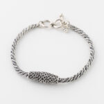 El cierre de la pulsera es de tipo toggle, con detalles decorativos que complementan el diseño de la pulsera. Este tipo de cierre asegura un ajuste cómodo y seguro en la muñeca.