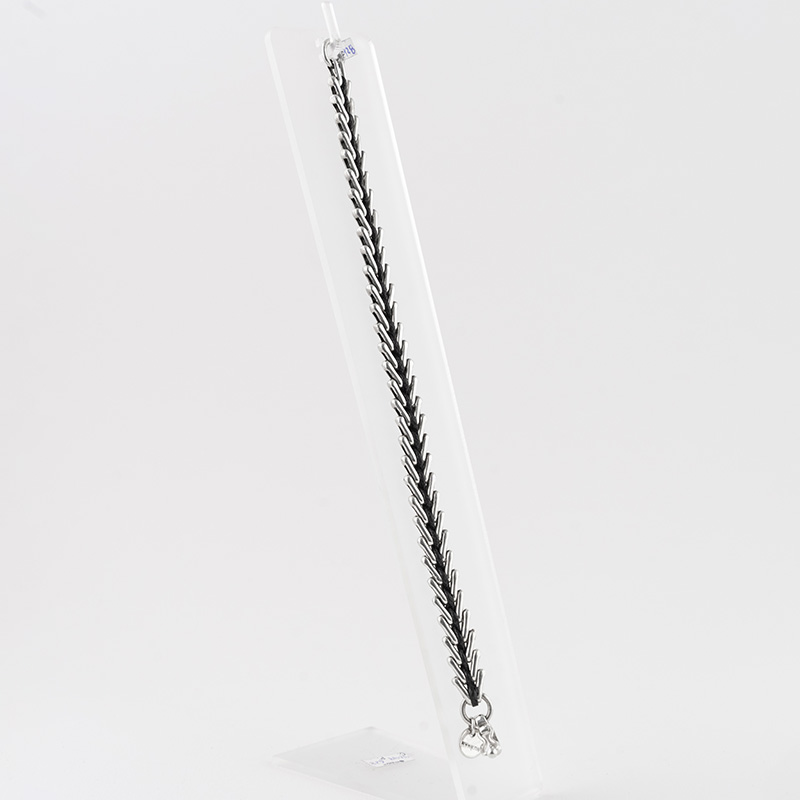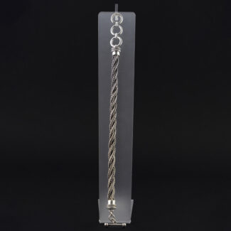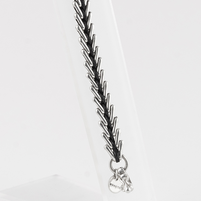 La Pulsera Rasta presenta un diseño audaz y llamativo. Los eslabones de plata en forma de espiga crean una base sólida y resistente, mientras que el cordón de macramé añade un toque de textura y movimiento. La combinación de estos dos elementos crea un contraste visual interesante y un efecto tridimensional.